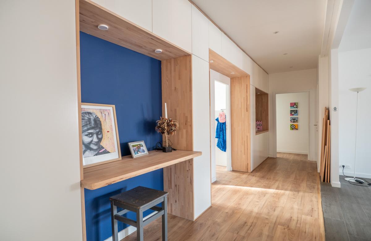 Un grand couloir traversant avec nombreux placards optimise les circulations et le rangement.