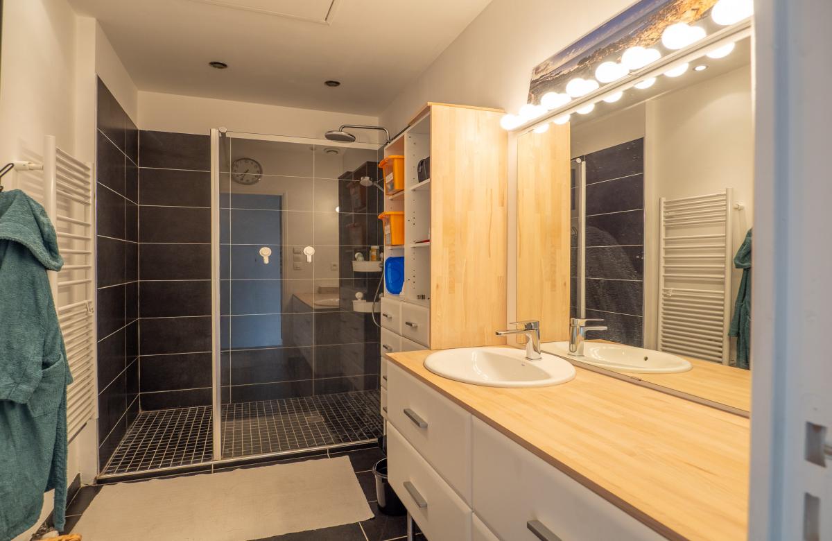 - 1 chambre parentale de 11 m2 avec lit double, intégrée dans un espace privatif comprenant un dressing aménagé de 5m2 ainsi qu'une salle de douche attenante et également un petit balcon.