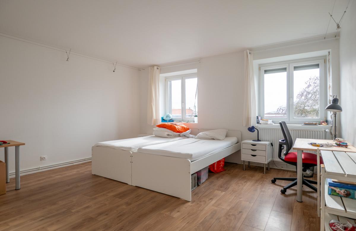 - 1 grande chambre de 20 m2 avec 2 lits simples et grands placards