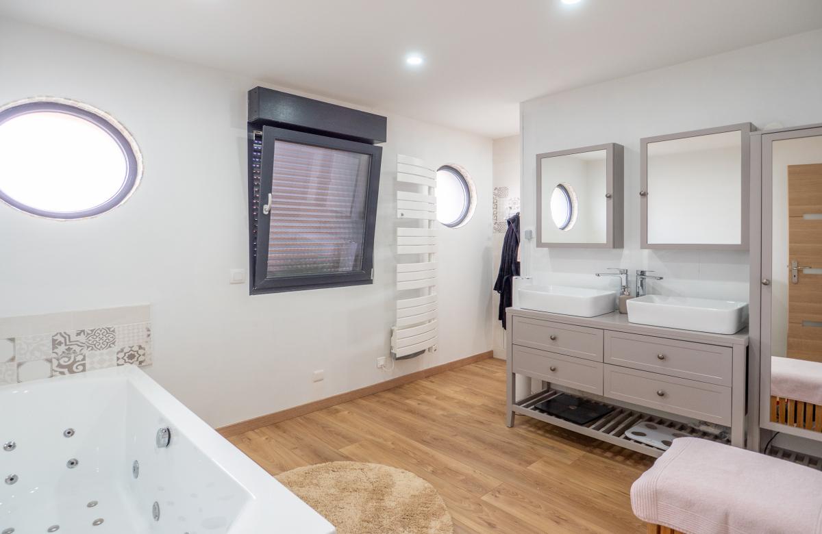 Séjour + cuisine équipée lumineux - Salle de bains complète -