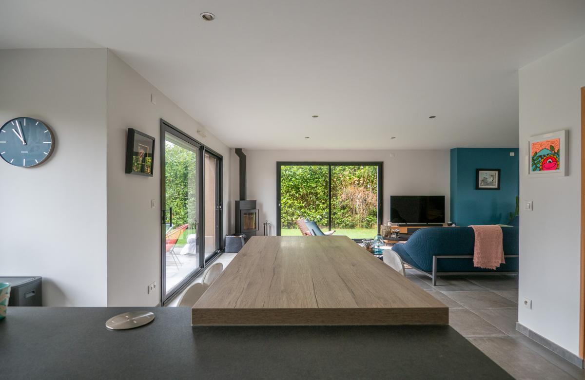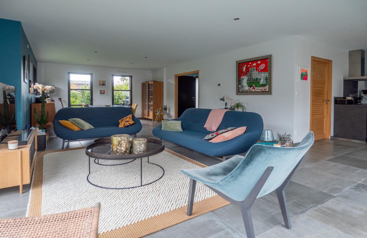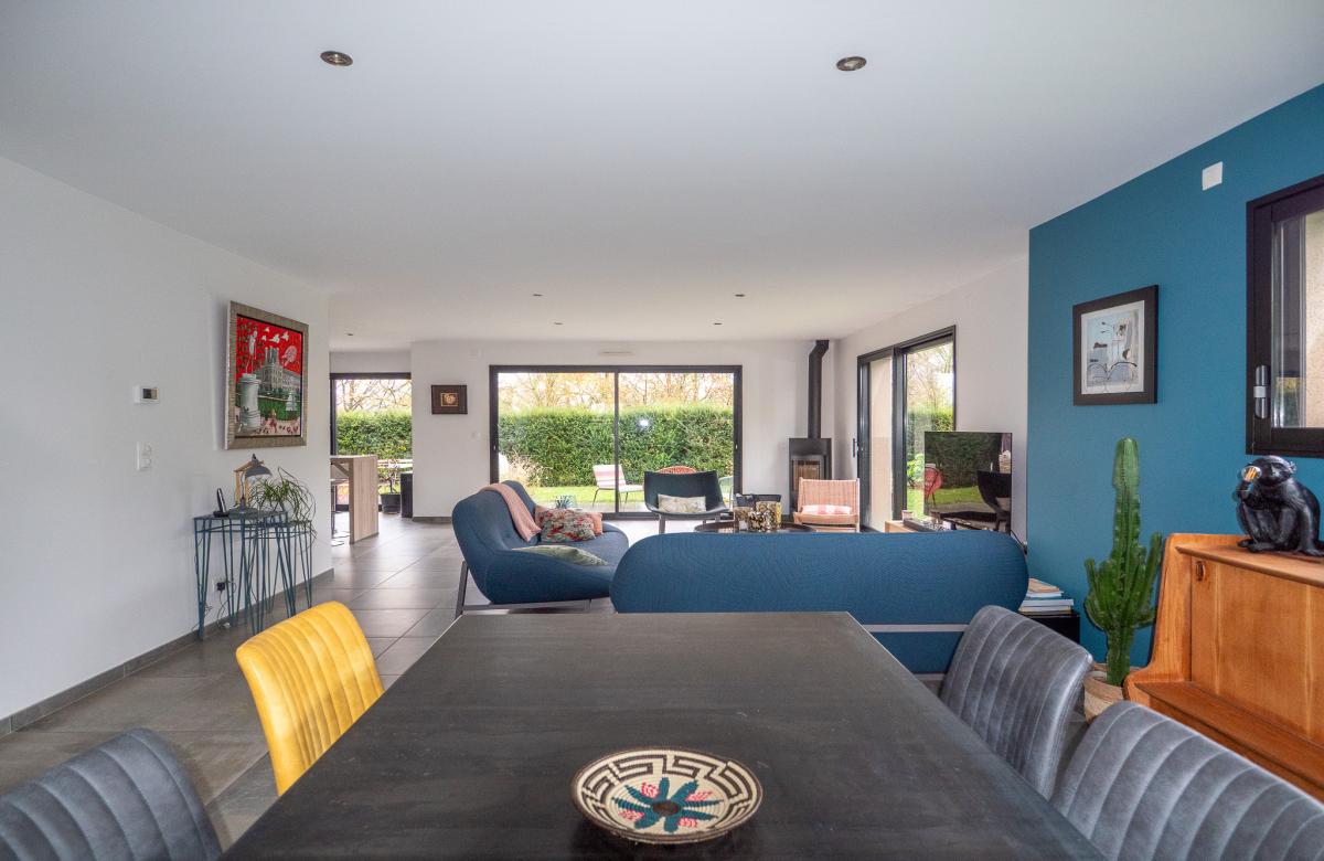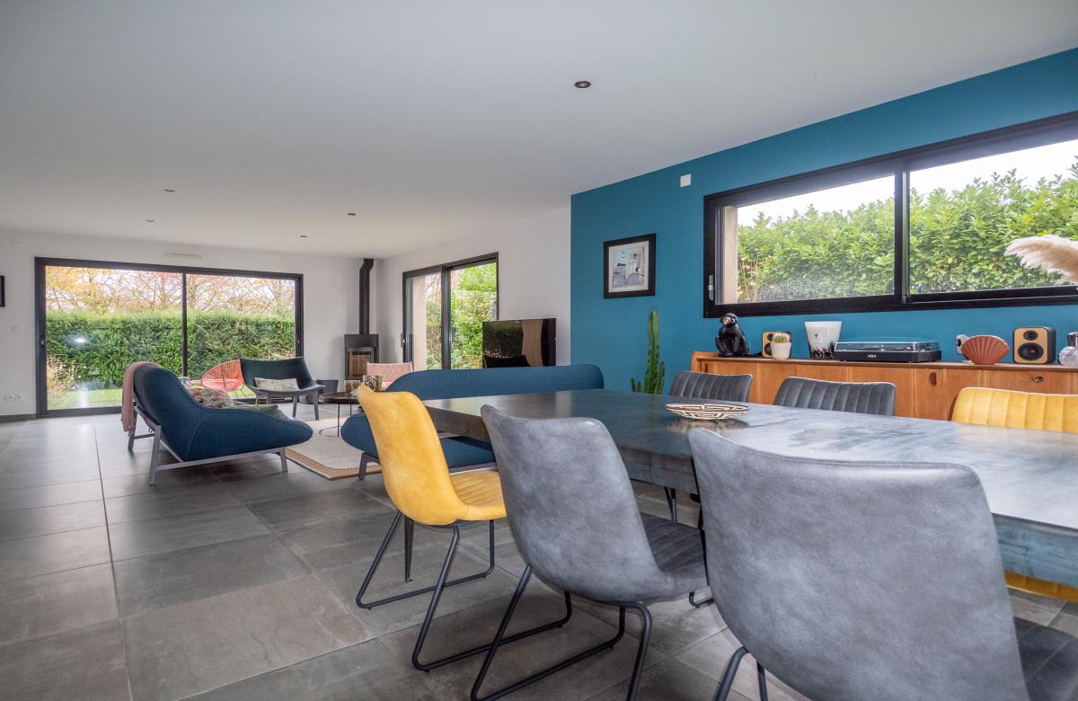 Dès l’entrée, vous serez séduit par un vaste espace de vie de 60 m2, baigné de lumière, comprenant un séjour chaleureux avec poêle à bois et une cuisine équipée haut de gamme, idéale pour recevoir famille et amis.