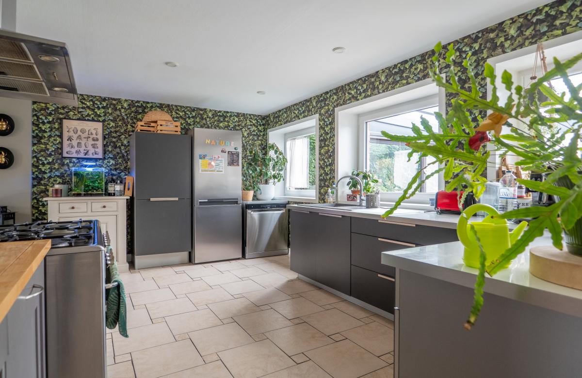 Le rez-de-chaussée propose une belle pièce de vie lumineuse avec salon équipé d’une cheminée feu de bois, une salle à manger et une cuisine équipée. Une véranda prolonge agréablement l’espace de vie vers le jardin.