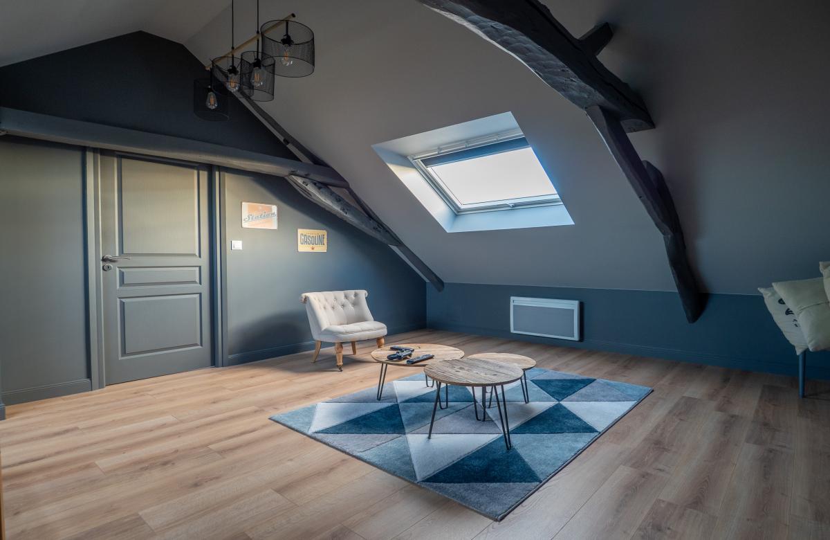 Le deuxième étage accueille un espace polyvalent idéal pour une salle télé, un bureau ou une salle de jeux, ainsi qu’une chambre supplémentaire.