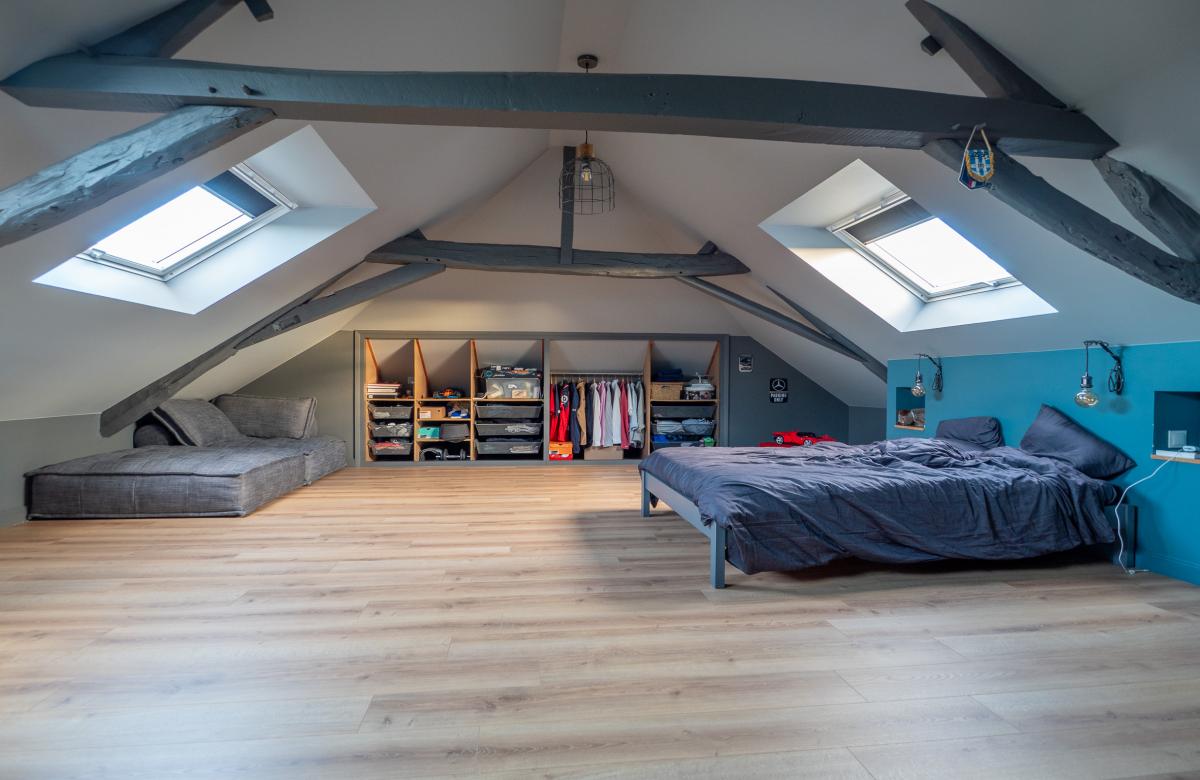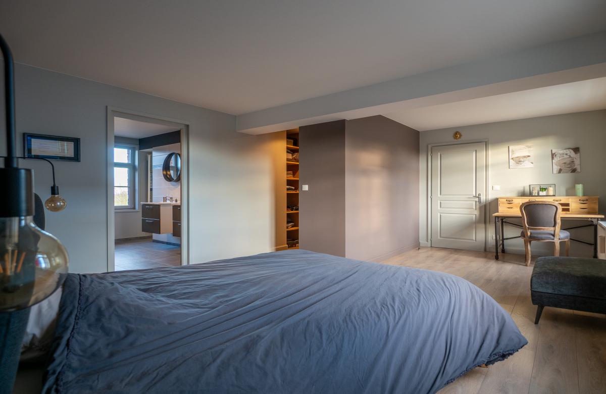 À l’étage, la partie nuit se compose de 4 chambres, d’une salle de douche familiale dont une suite parentale avec chambre, dressing et salle de douche privative.