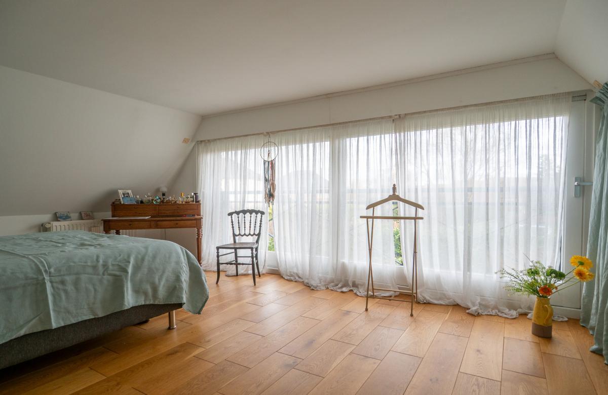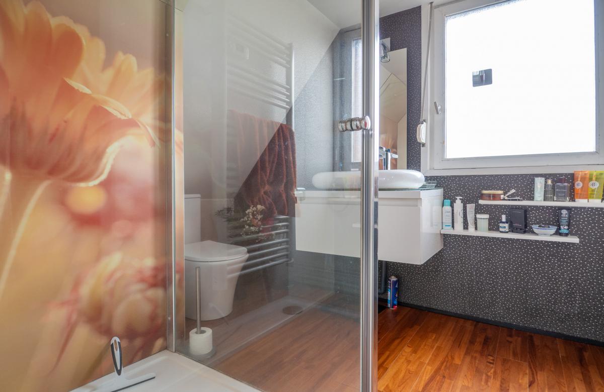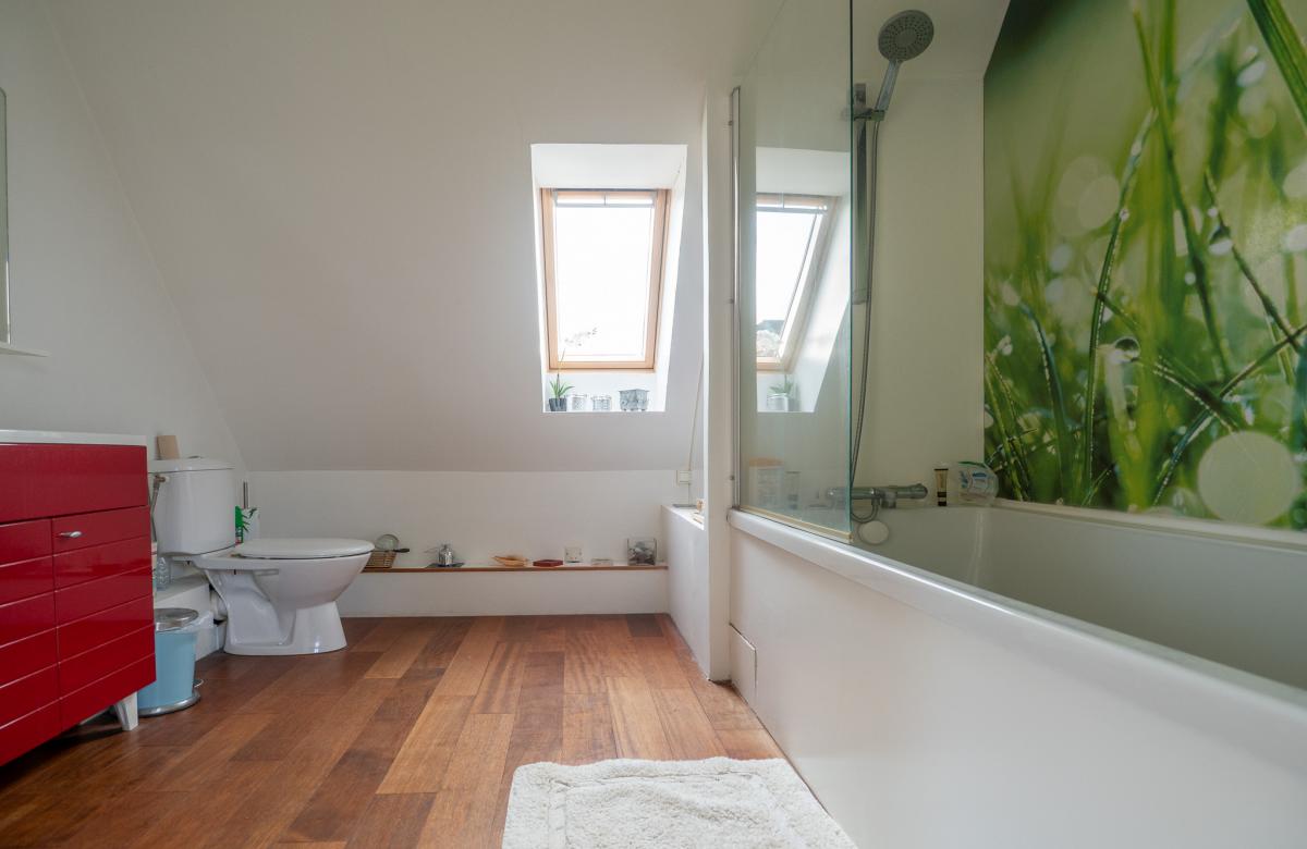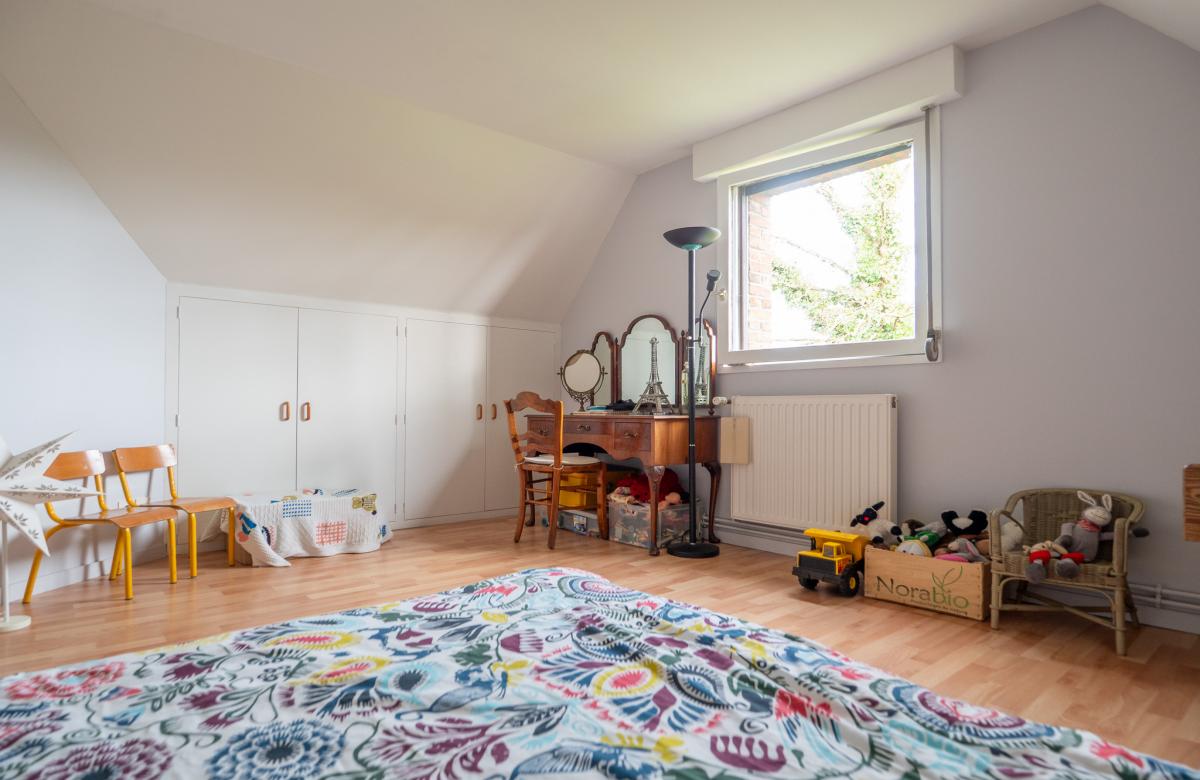 À l’étage, l’espace parental indépendant dispose d’une chambre avec dressing et salle d’eau, et s’ajoutent 2 autres chambres ainsi qu’une salle de bain familiale.