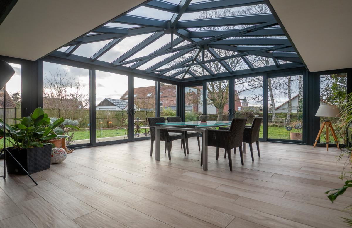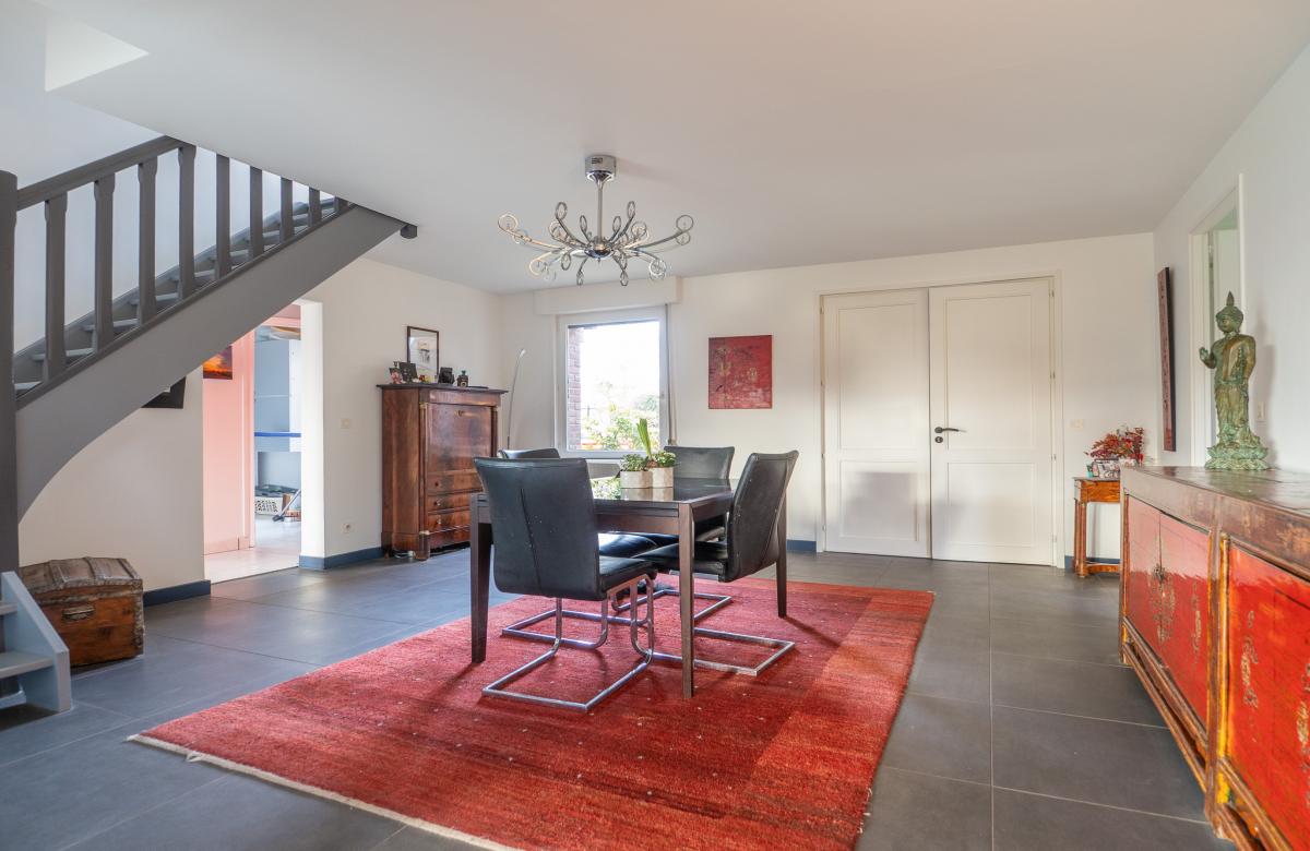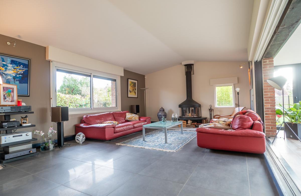 Le séjour lumineux de 50 m2 avec poêle à bois s’ouvre sur une extension salle à manger de 28 m2, idéale pour les grandes tablées familiales ou les réceptions.