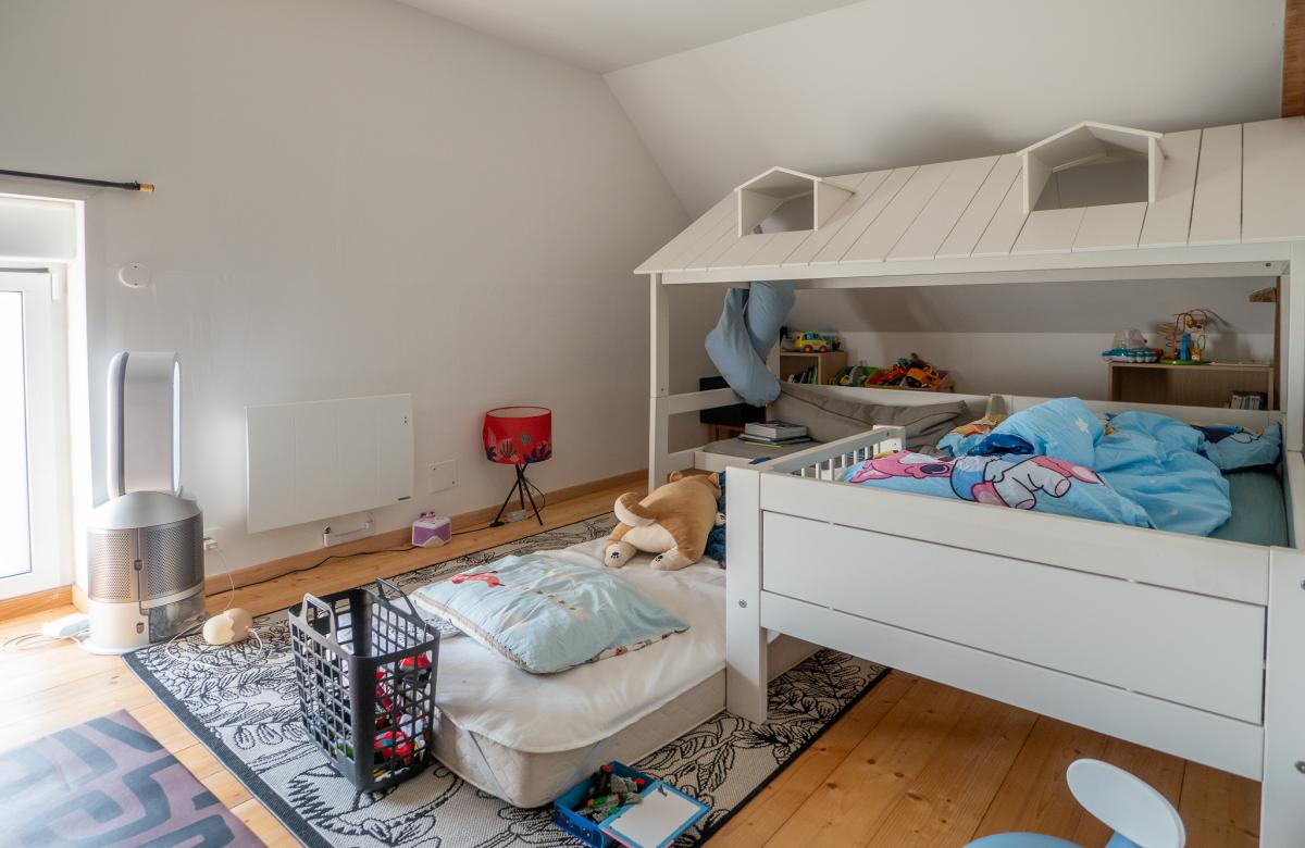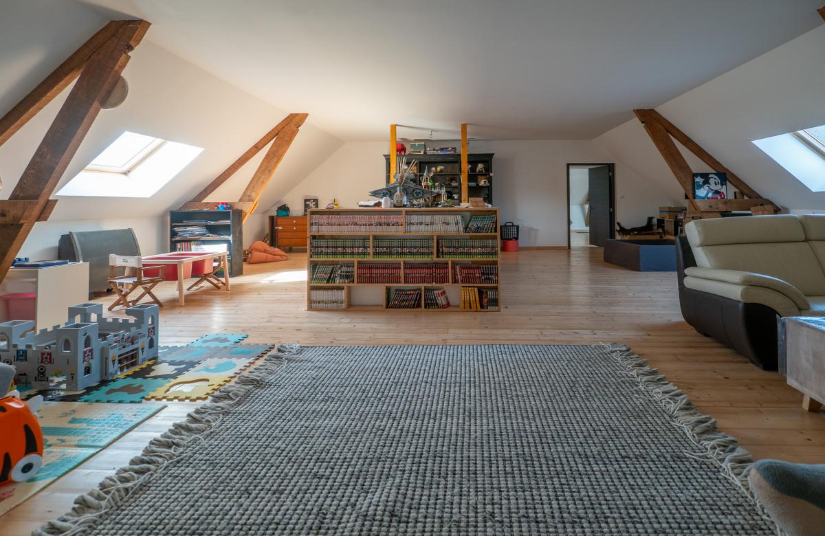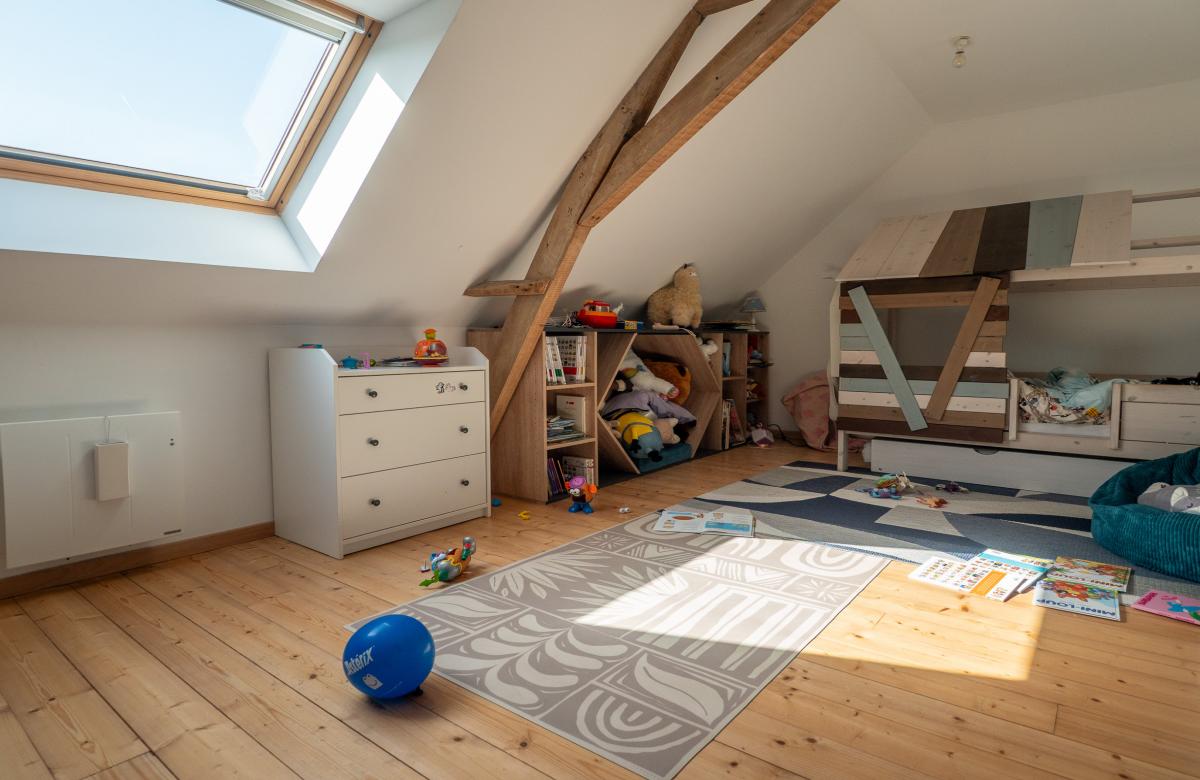 À l’étage, les volumes se prolongent avec une distribution idéale pour une vie de famille, comprenant une grande salle de jeux de 52 m2, 2 chambres, une salle de bains, ainsi qu’une suite parentale confortable avec dressing et salle de bain, offrant un espace nuit indépendant et privilégié.