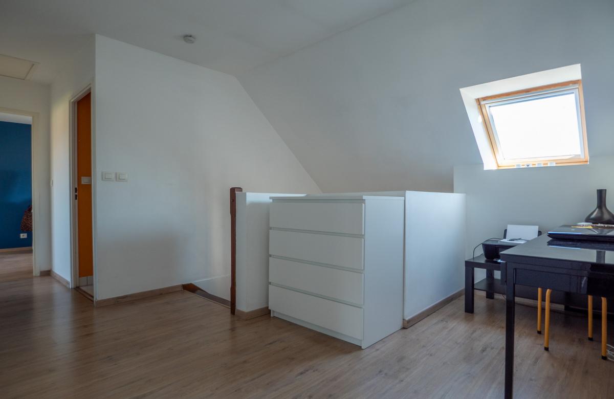 Le rez-de-chaussée se compose d'un espace de vie ouvert, lumineux, avec salon et salle à manger avec insert Stûv, prolongé par une cuisine moderne ouverte sur le jardin. Une buanderie complète ce niveau.