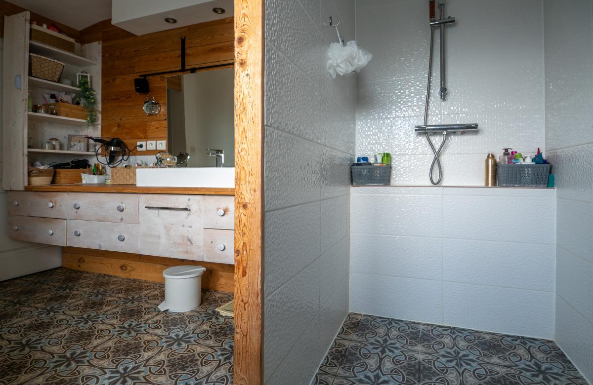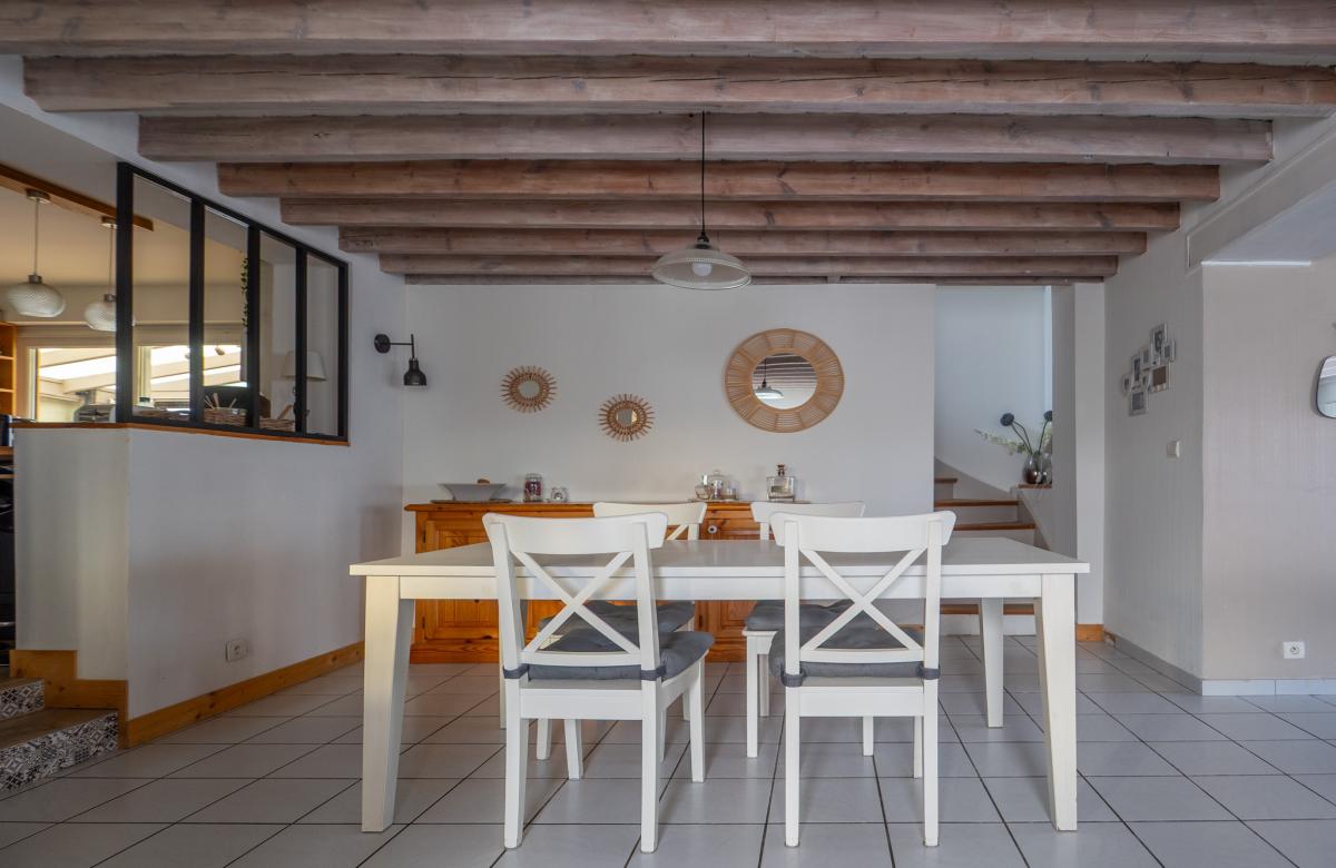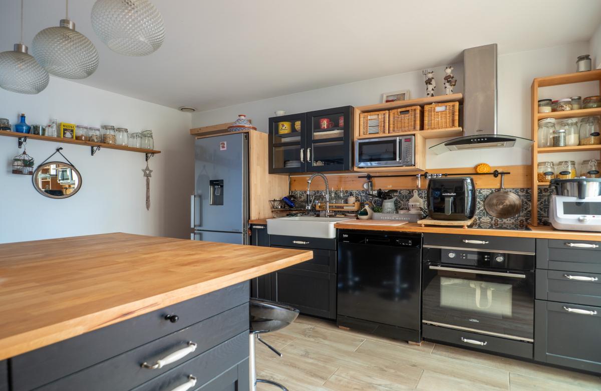 Elle offre un grand séjour de 45 m2 baigné de lumière, agrémenté d’une cheminée feu de bois, idéal pour des moments chaleureux en famille ou entre amis. La cuisine équipée est fonctionnelle et conviviale, ouverte sur une véranda lumineuse, véritable pièce de vie supplémentaire.