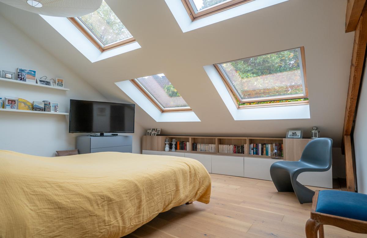 À l’étage un appartement parents avec chambre salle de bain et dressing, deux autres chambres ,un bureau en mezzanine et une salle de douche supplémentaire