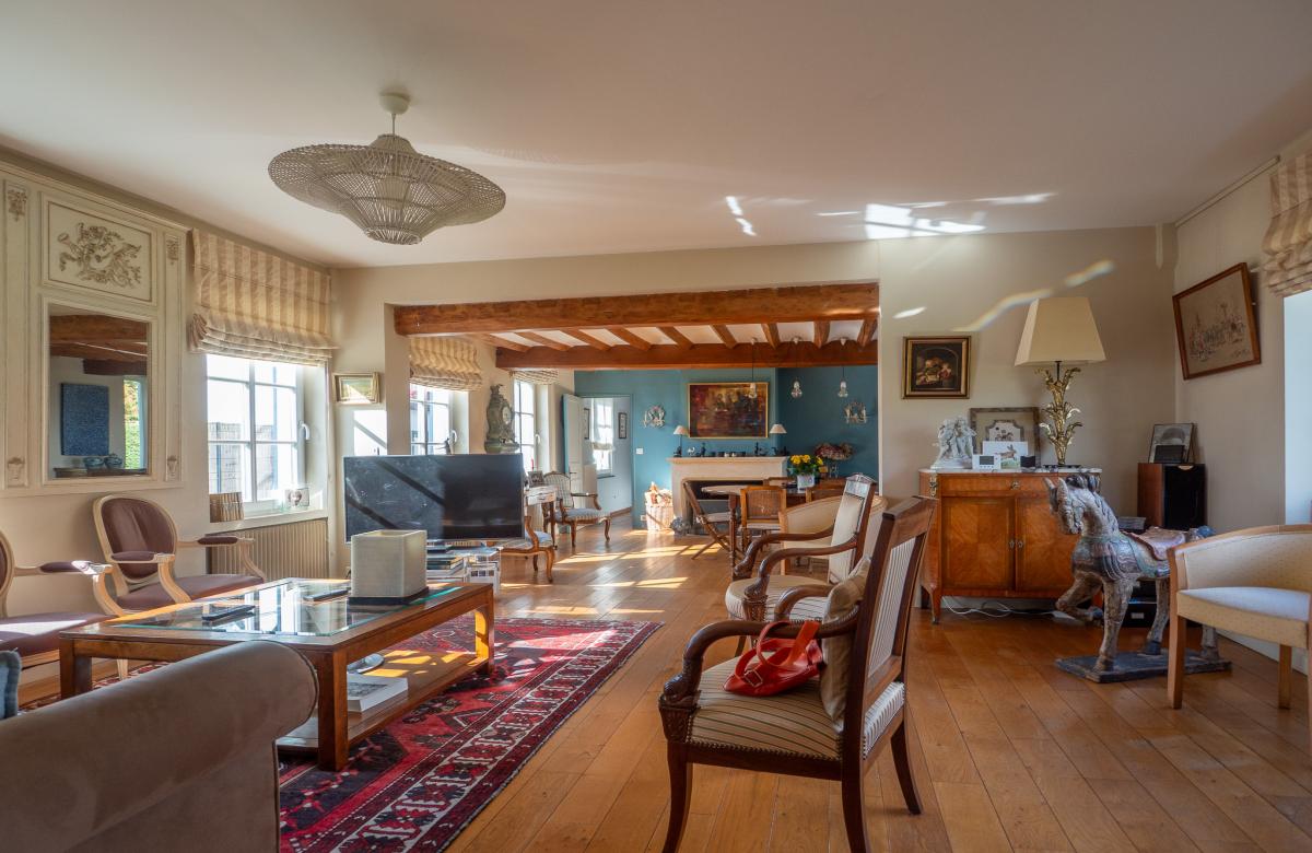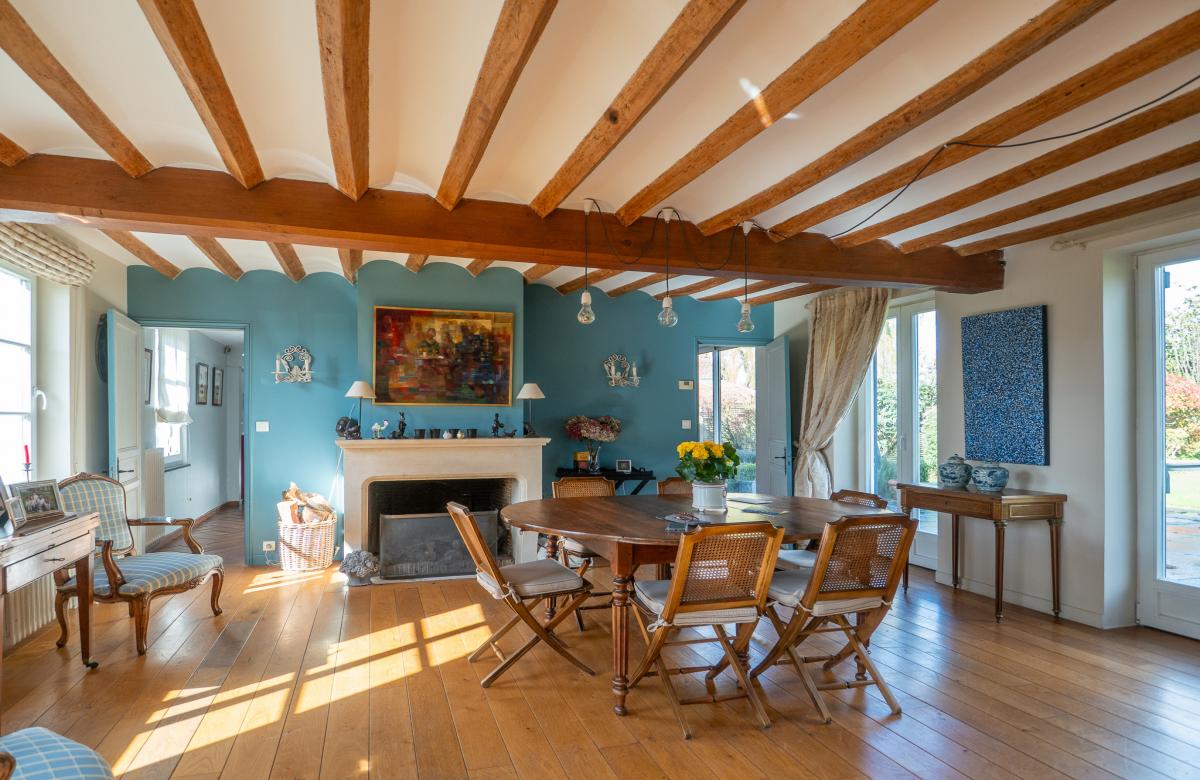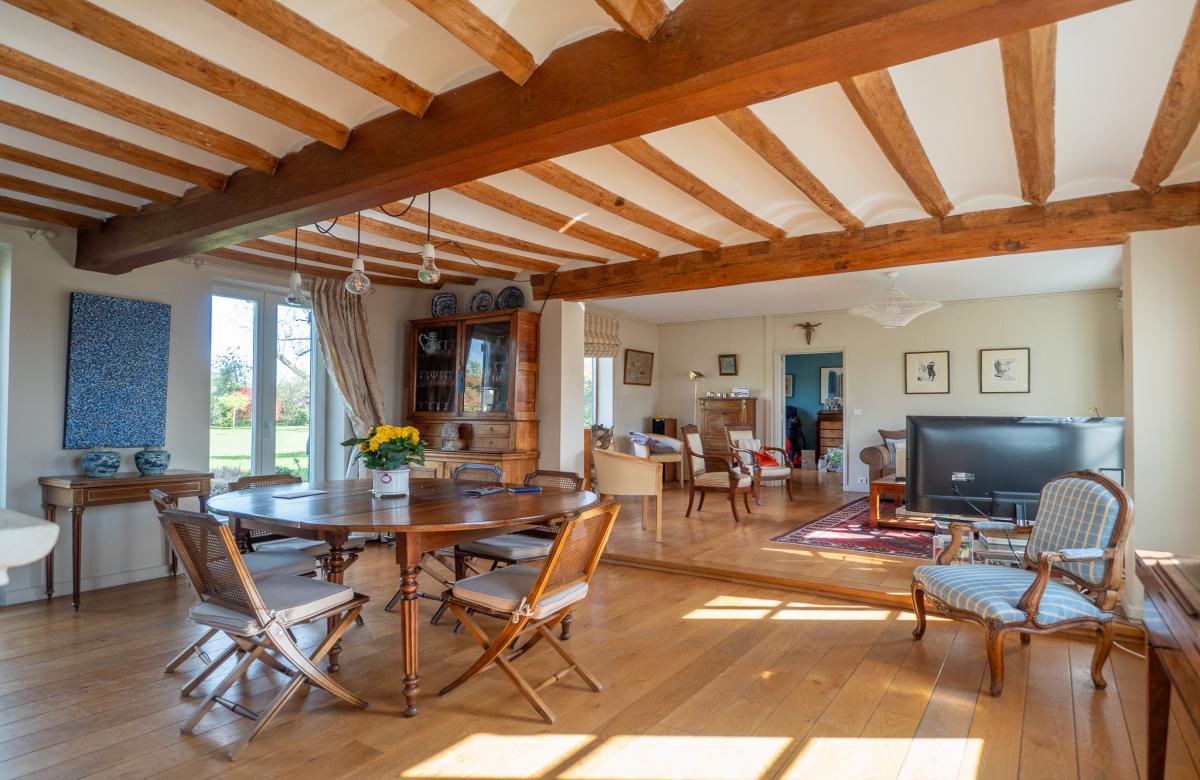 Dès l’entrée, vous serez séduit par un vaste salon-séjour traversant, baigné de lumière, sublimé par un parquet chaleureux et de magnifiques poutres apparentes, offrant un cachet authentique incomparable.