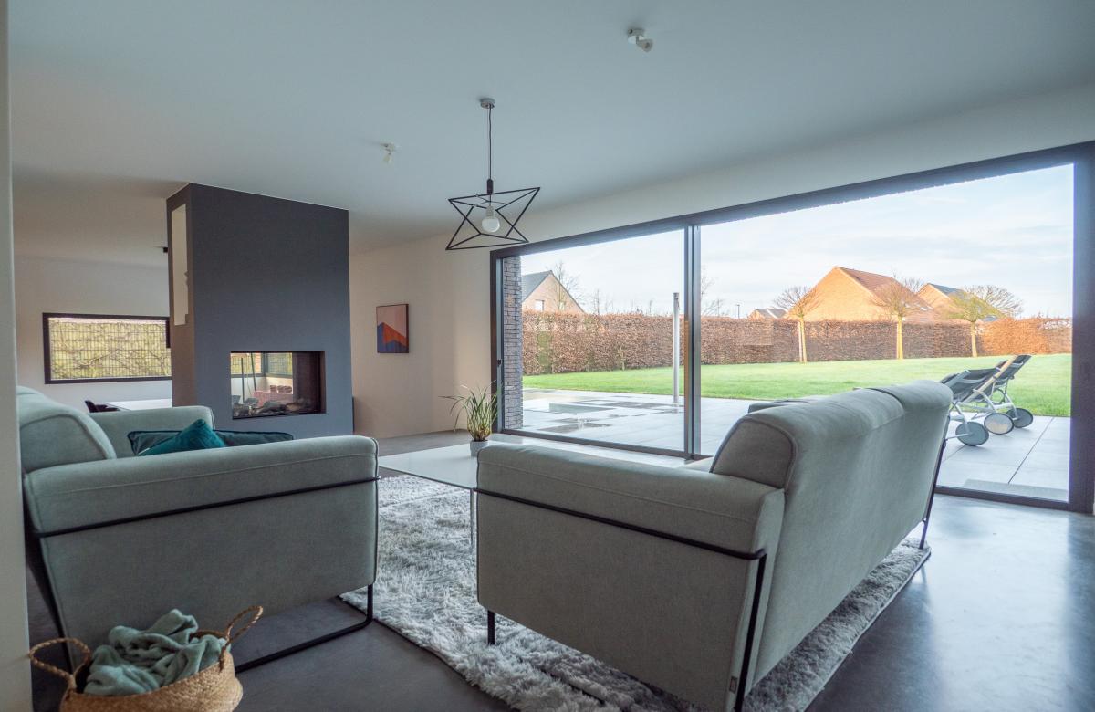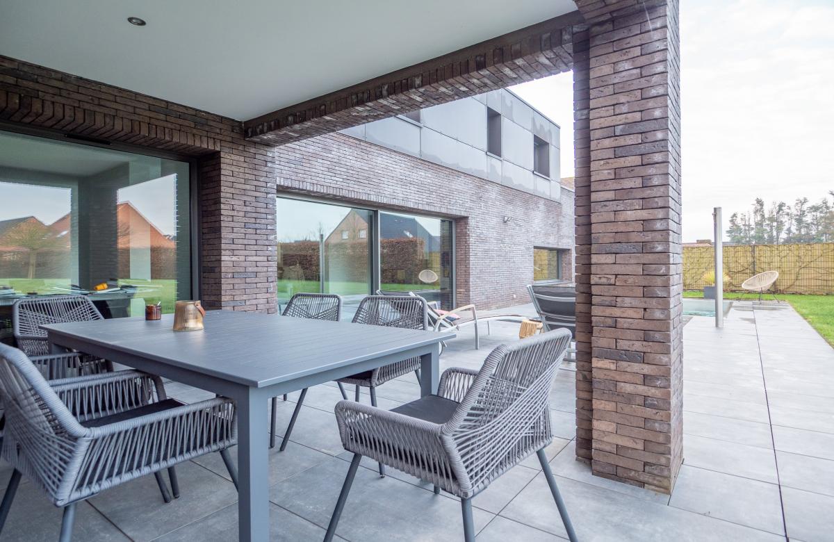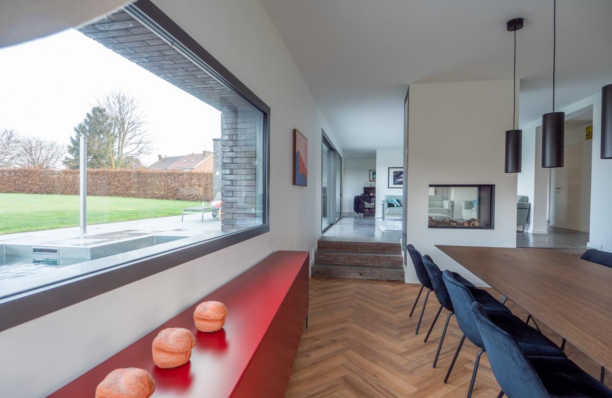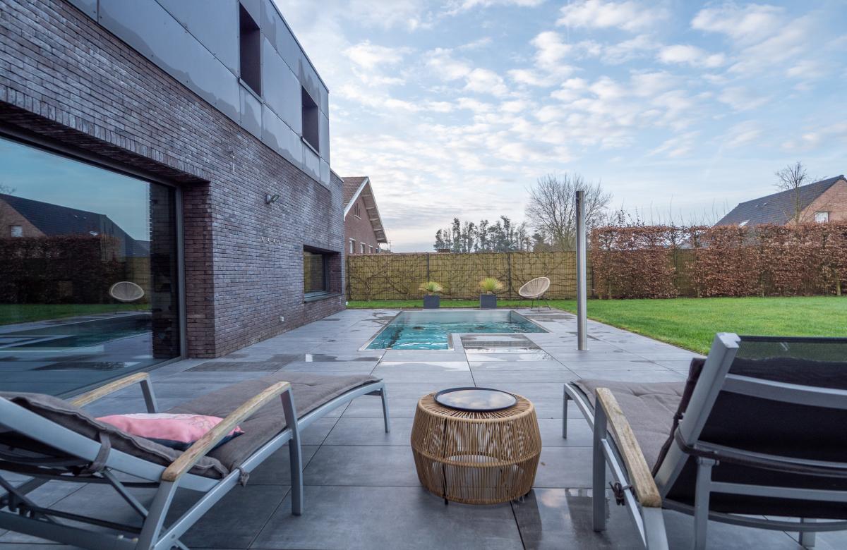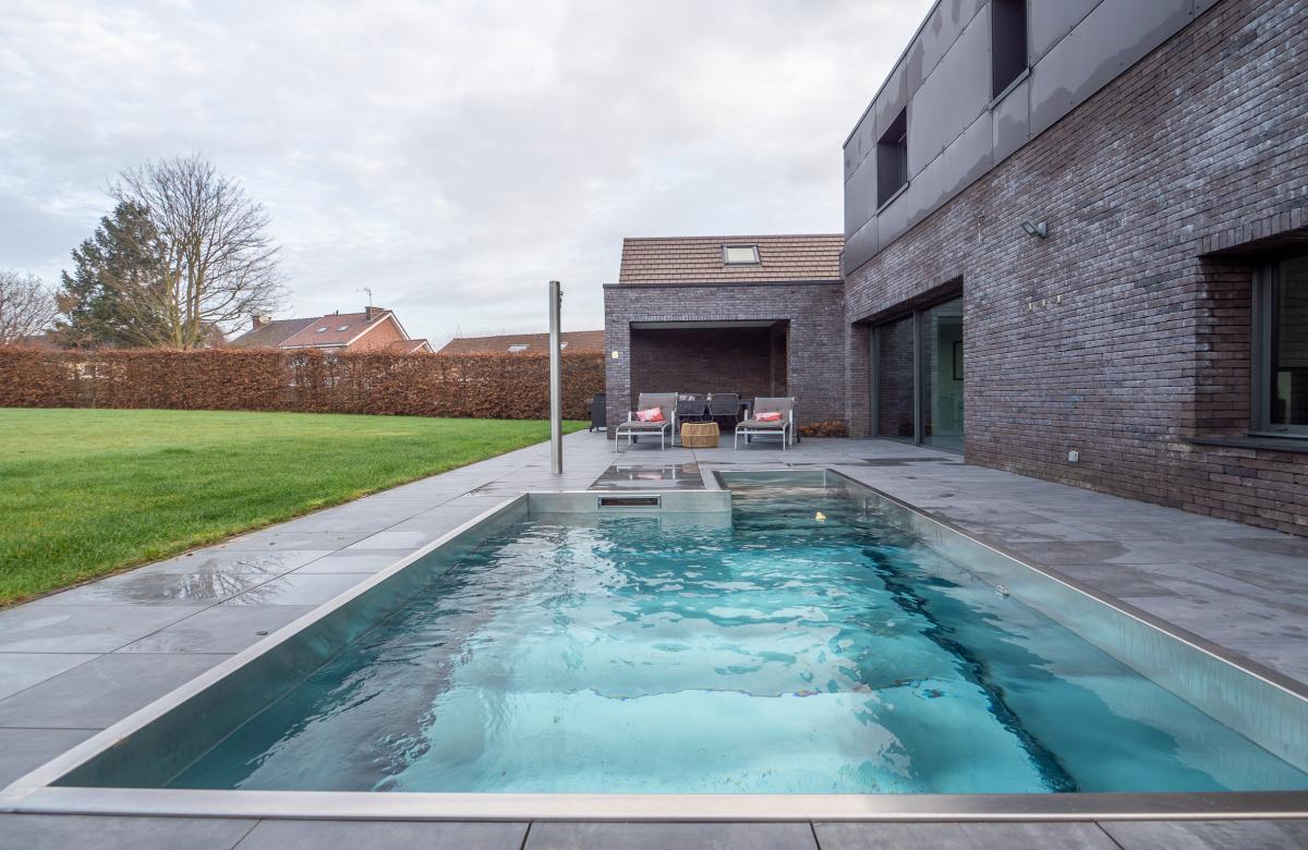 La maison offre également un chauffage au sol sur les deux niveaux, un garage, une buanderie, un jardin avec grande terrasse et une piscine avec bassin en inox