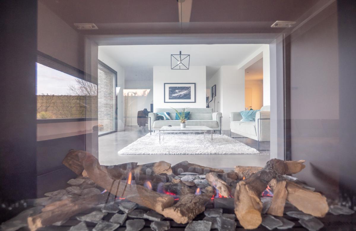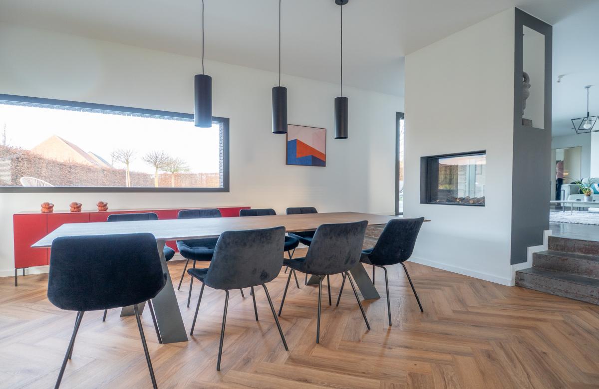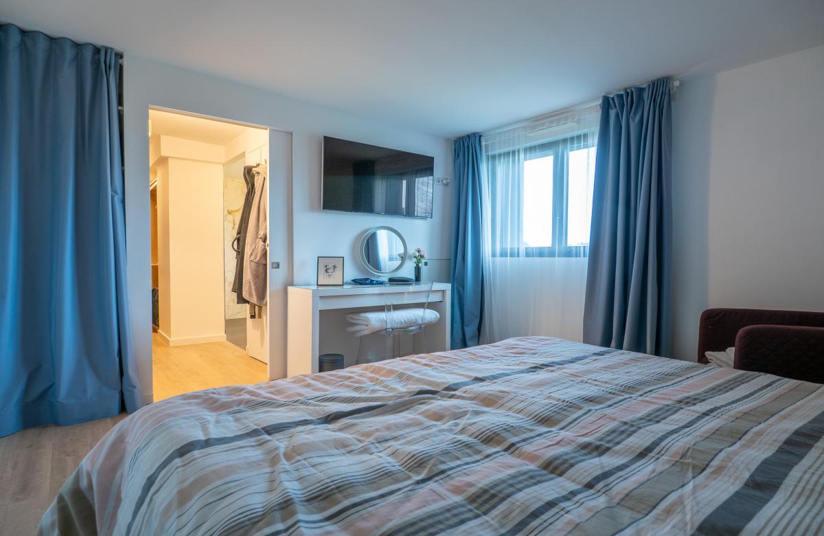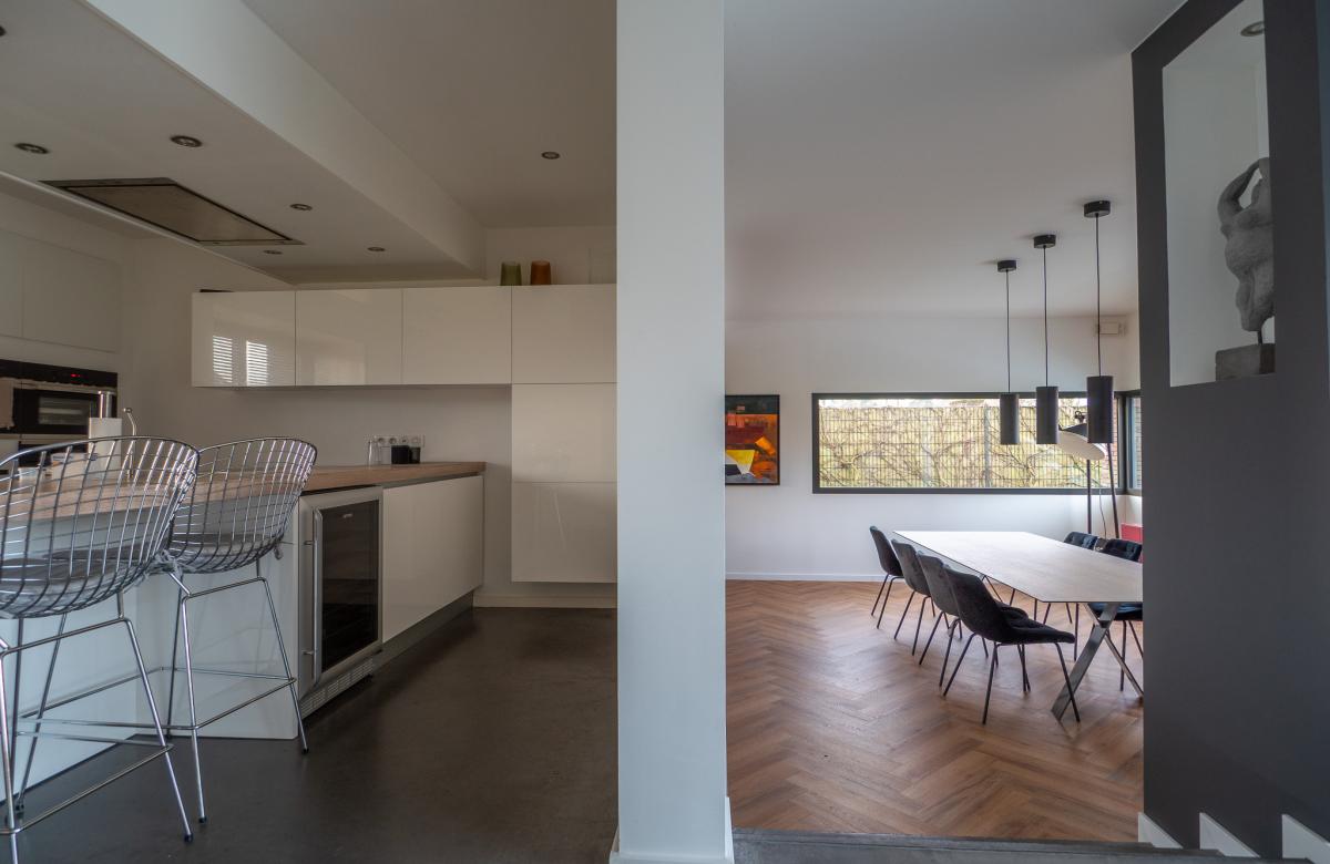 Le rez-de-chaussée propose un hall d’entrée soigné, un premier salon avec cheminée gaz double foyer, une salle à manger lumineuse, une cuisine équipée contemporaine, une salle télévision indépendante ainsi qu’un bureau. Une chambre en rez-de-chaussée permet l’aménagement d’une suite parentale
