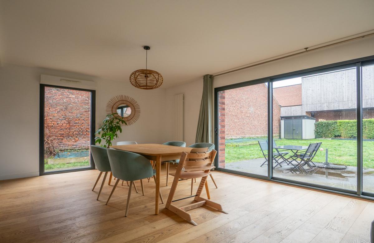Située à proximité immédiate de Sainghin-en-Mélantois, dans un environnement calme et résidentiel, cette maison cubique en brique de 2014 développe 110 m2 habitables et offre un cadre de vie contemporain et lumineux