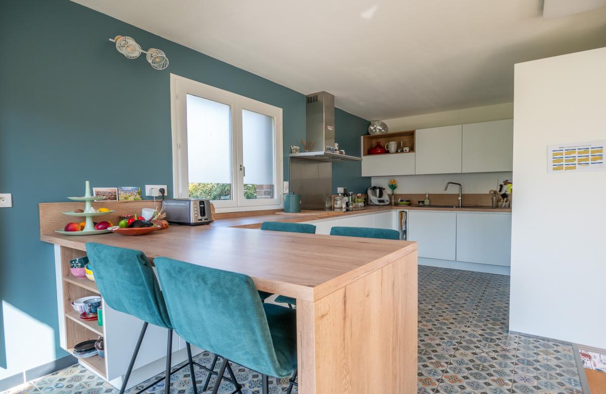 Le séjour lumineux et la cuisine équipée offrent un bel espace de vie de 65 m2, ouvert sur le jardin.