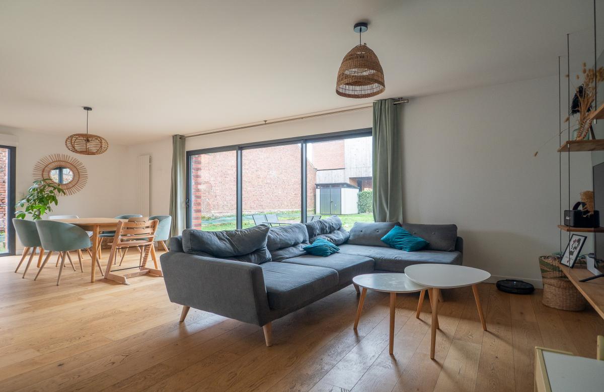 Située à proximité immédiate de Sainghin-en-Mélantois, dans un environnement calme et résidentiel, cette maison cubique en brique de 2016 développe 110 m2 habitables et offre un cadre de vie contemporain et lumineux