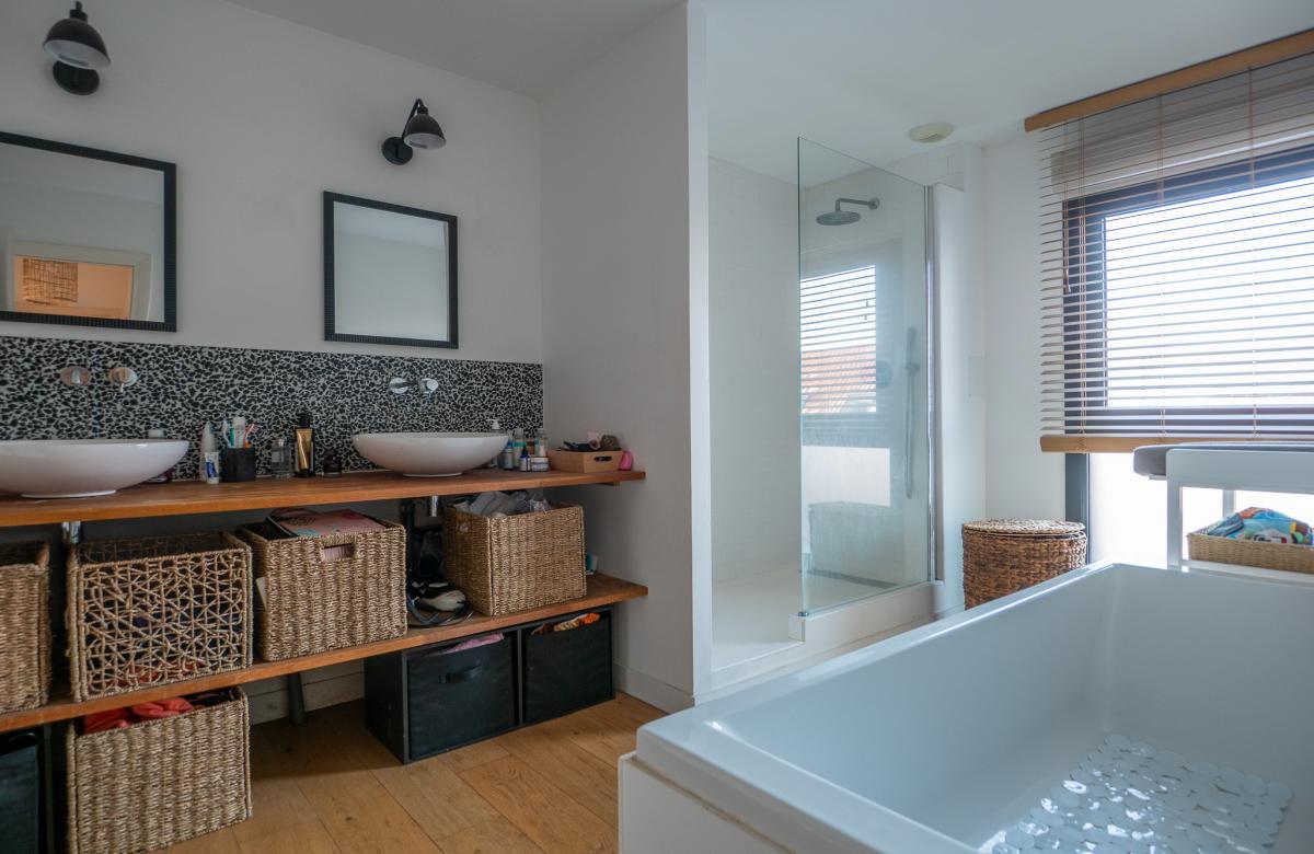 À l’étage, la partie nuit se compose de trois chambres confortables, dont une suite avec dressing, ainsi qu’une salle de bain complète avec baignoire et douche