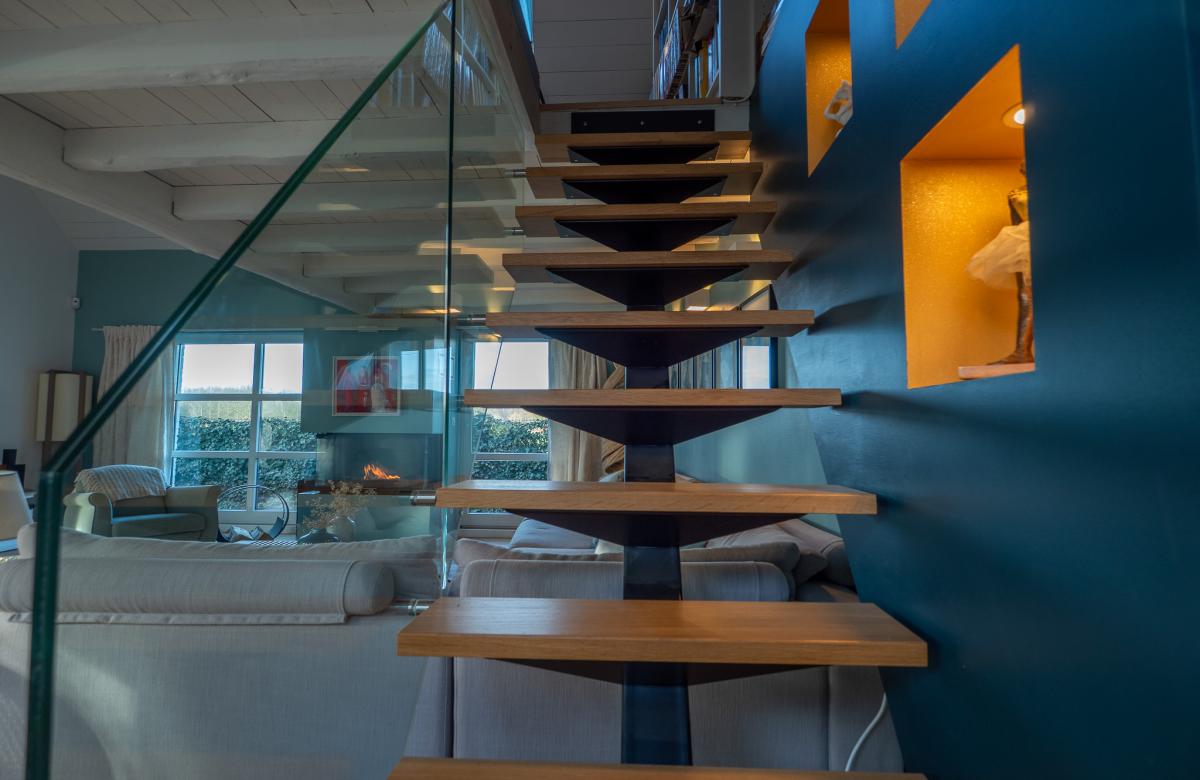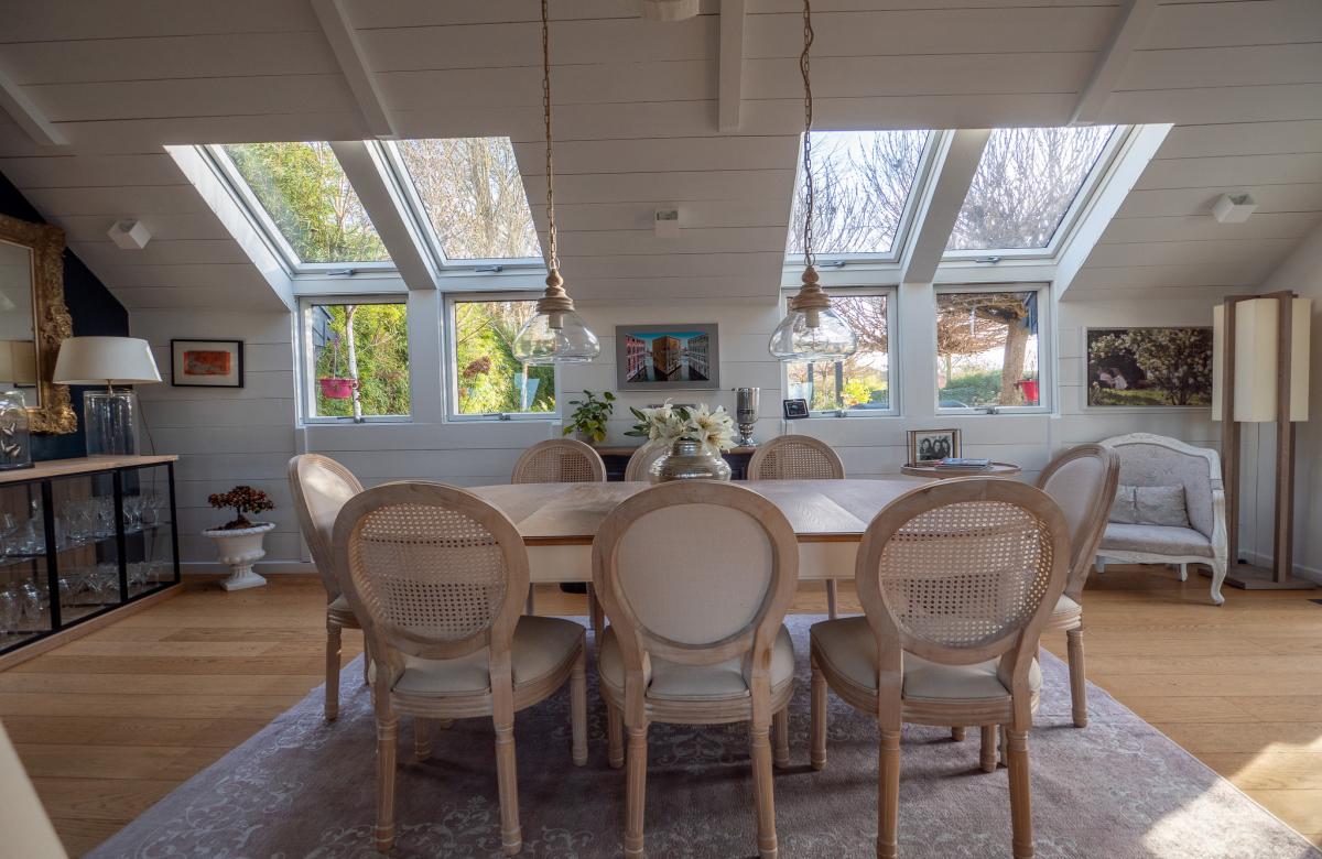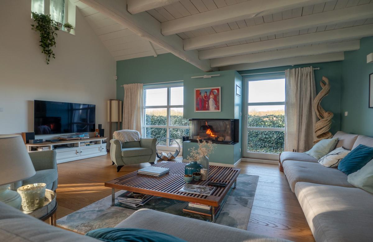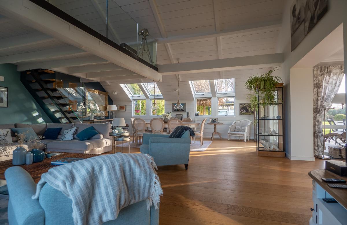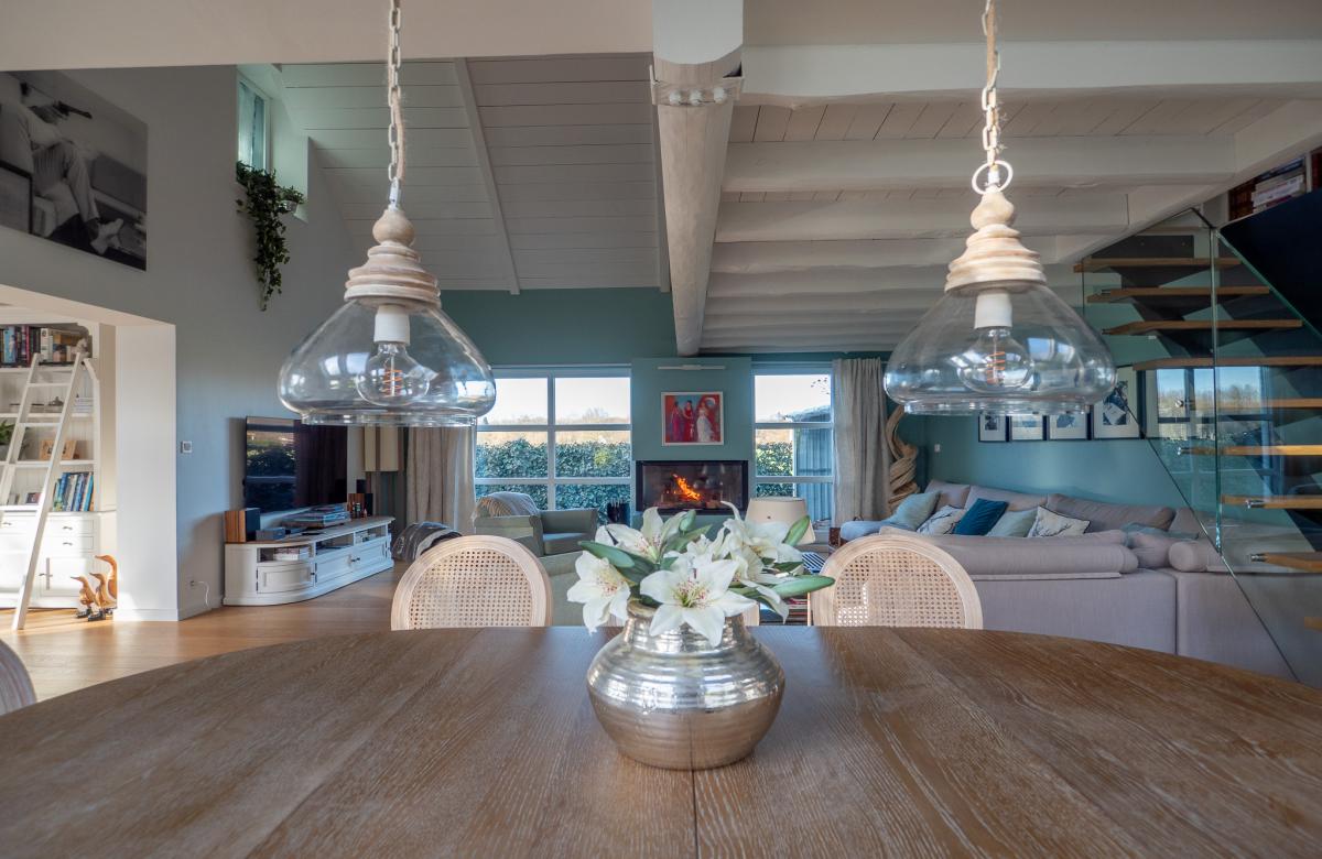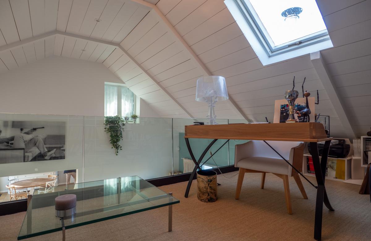 La maison propose un hall d’entrée donnant sur une vaste pièce de vie baignée de lumière, avec une salle à manger, une cuisine équipée haut de gamme avec un grand cellier, et un salon cathédrale doté d’une cheminée feu de bois avec insert. Une mezzanine, idéale pour un bureau, surplombe cet espace chaleureux. Le rez-de-chaussée dispose également de 2 chambres et d’une salle de bain complète. À l’étage, une chambre supplémentaire avec une salle de douche privative.
