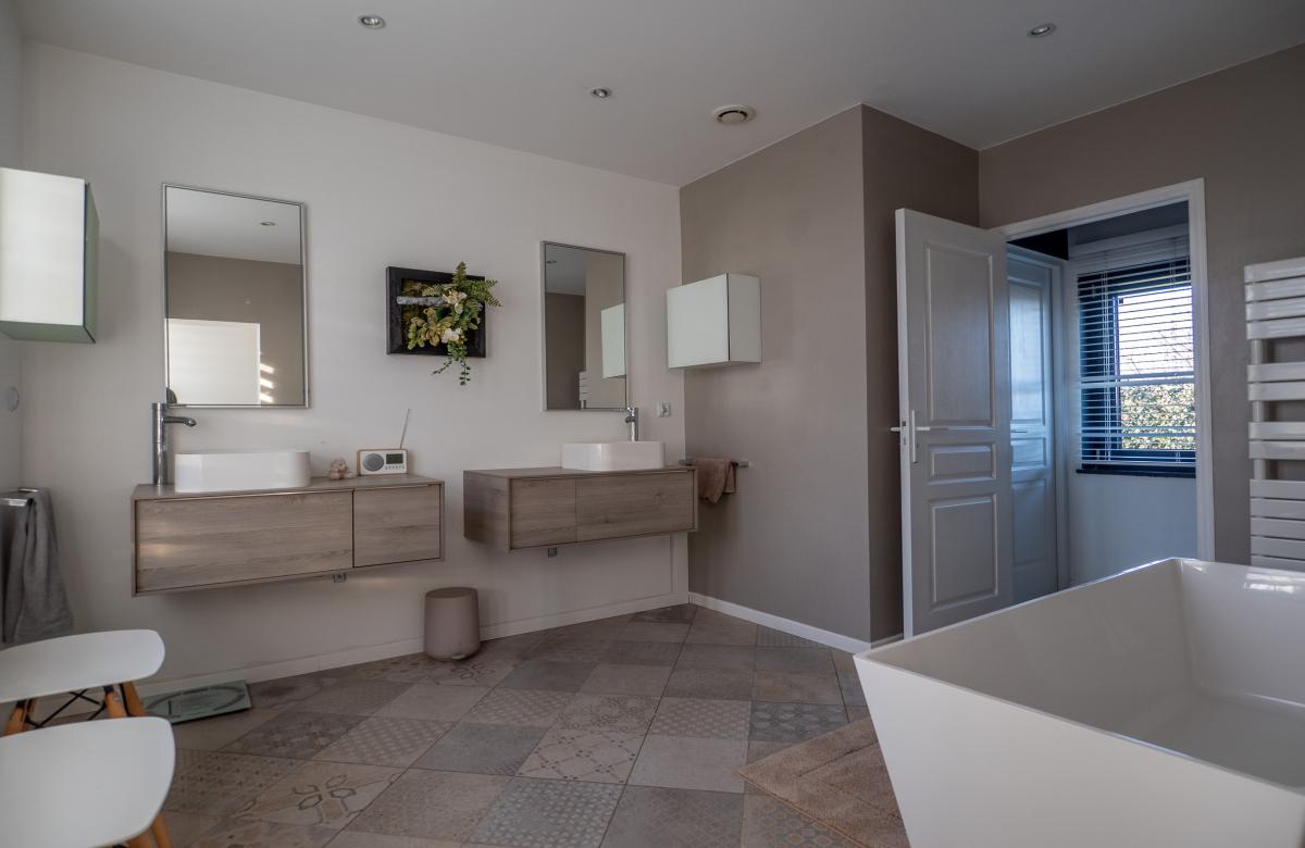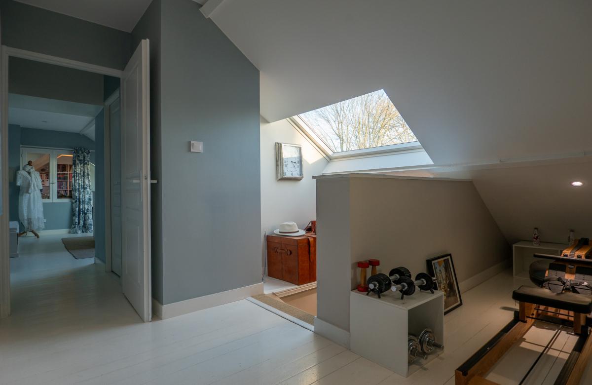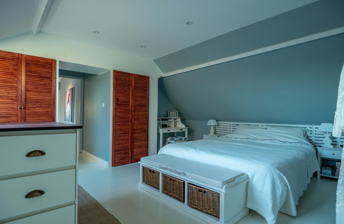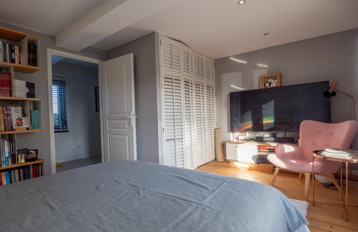 Un étage indépendant accueille un appartement parental, comprenant une chambre, un dressing spacieux, une salle d’eau avec douche et WC séparé, offrant intimité et confort.