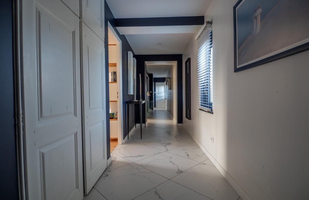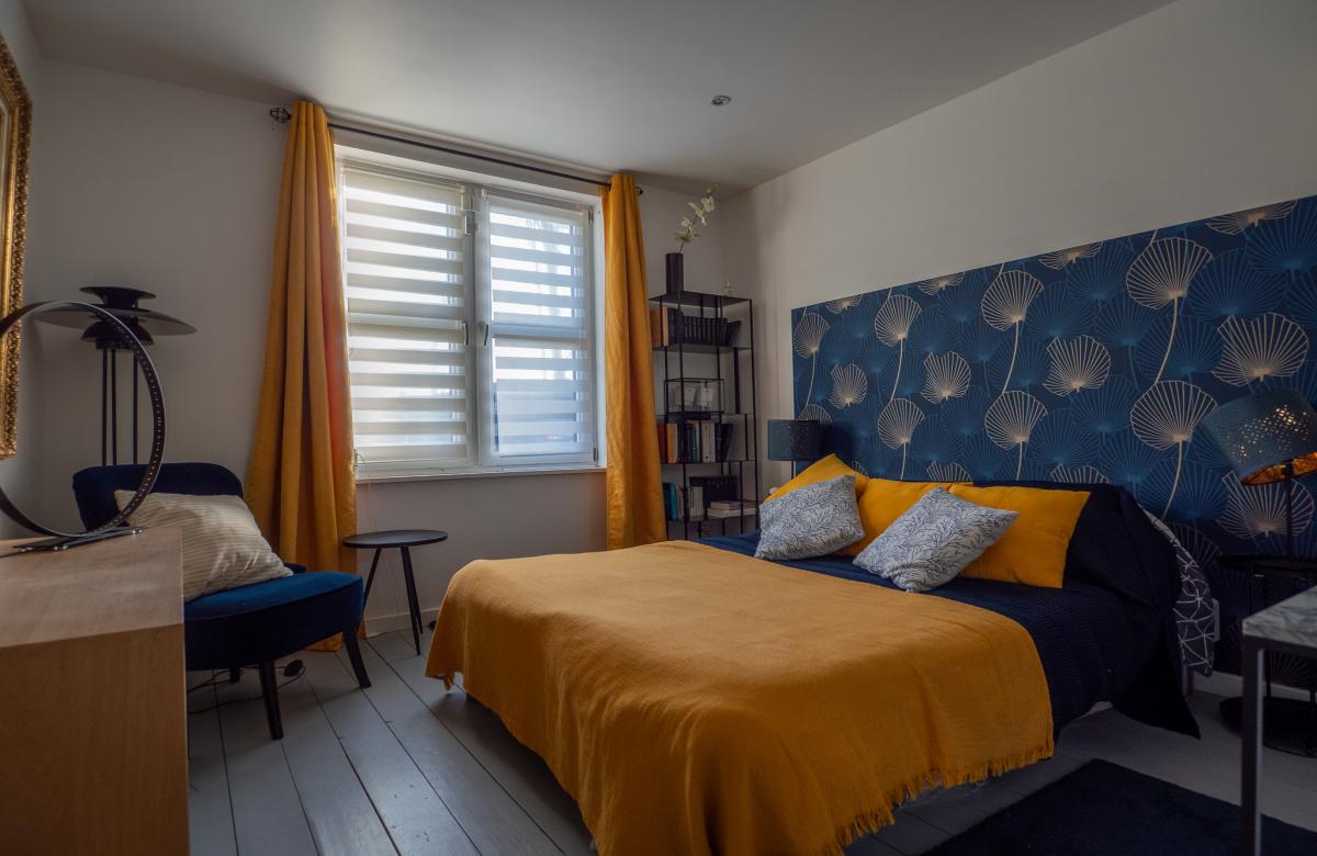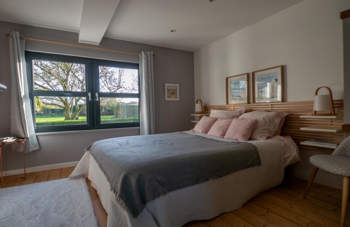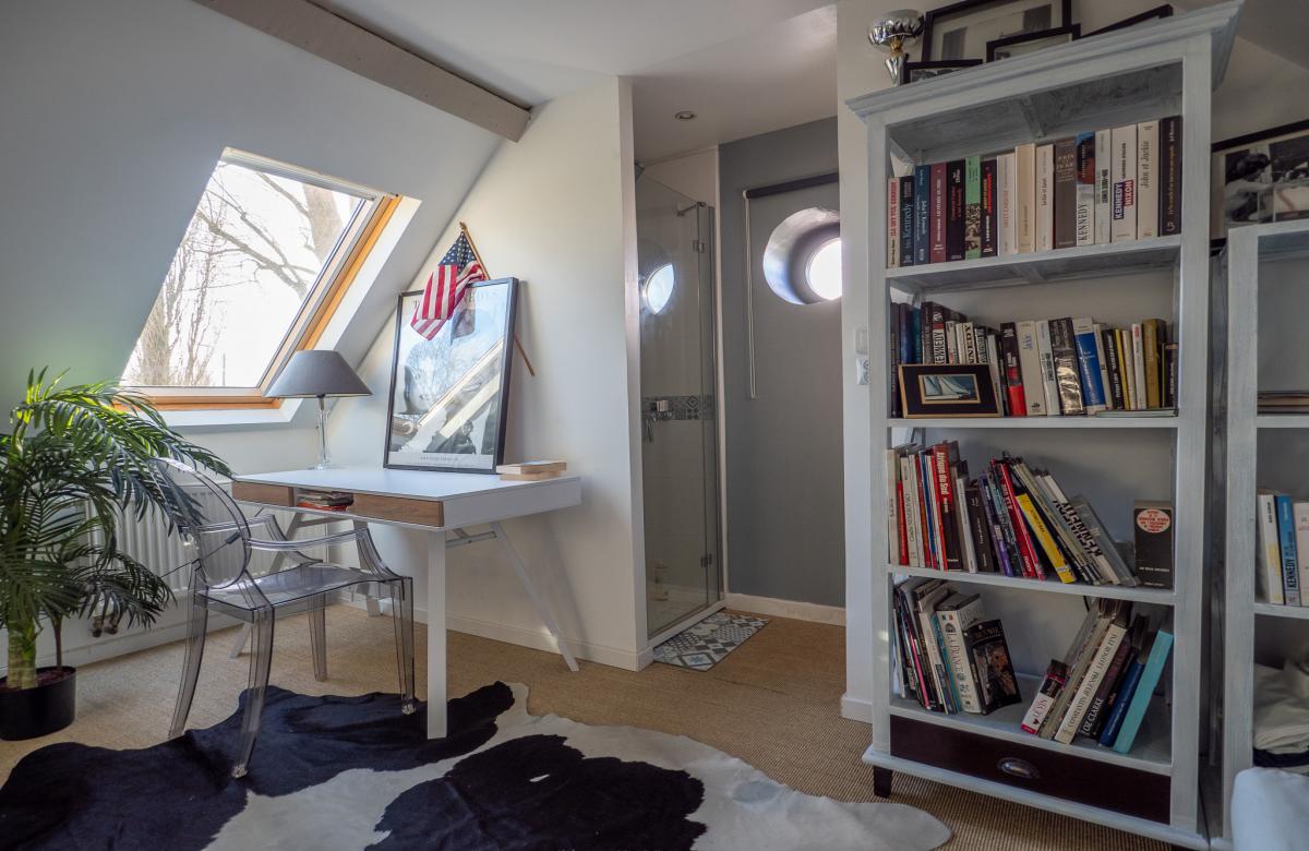 Un étage indépendant accueille un appartement parental, comprenant une chambre, un dressing spacieux, une salle d’eau avec douche et WC séparé, offrant intimité et confort.