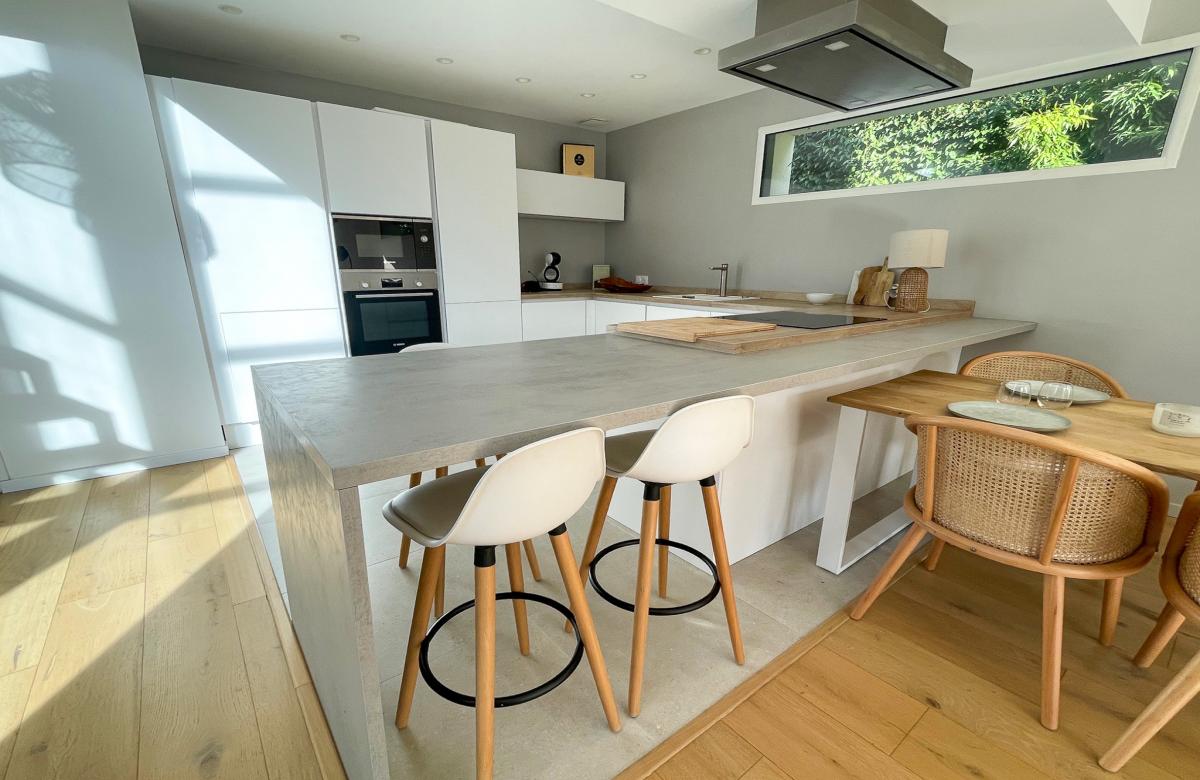 Développant 130 m2 habitables sur une parcelle de 374 m2, la maison offre au rez-de-chaussée une vaste pièce de vie baignée de lumière, avec une cuisine ouverte entièrement équipée, idéale pour les moments de convivialité.