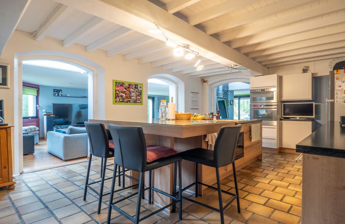 Une cuisine équipée ouverte complète l’espace de vie, idéal pour recevoir ou partager des moments en famille