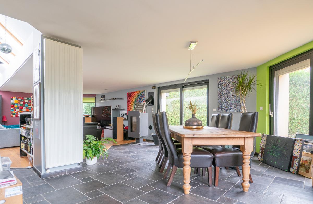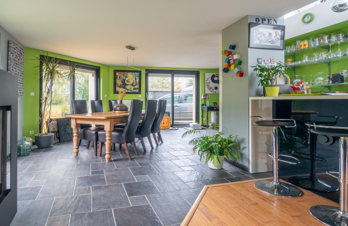 Dès l’entrée, un hall distribue une vaste salle à manger ouverte sur un premier salon chaleureux avec poêle à bois, suivi d’un second salon cosy avec cheminée feu de bois, offrant une ambiance authentique et conviviale
